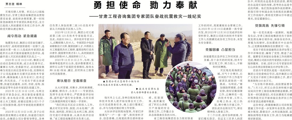 1月15日,《甘肅日報》第4版刊載《勇?lián)姑?勠力奉獻(xiàn)——甘肅工程咨詢集團(tuán)專家團(tuán)隊奮戰(zhàn)抗震救災(zāi)一線紀(jì)實(shí)》。該報道全面反映了集團(tuán)公司黨委心系災(zāi)區(qū)、聞令而動的一系列擔(dān)當(dāng)作為務(wù)實(shí)舉措,深度展現(xiàn)了專家團(tuán)隊和干部職工向險而行、甘于奉獻(xiàn)的抗震救災(zāi)生動實(shí)踐,進(jìn)一步凝聚起奮力奪取抗震救災(zāi)全面勝利的強(qiáng)大力量。