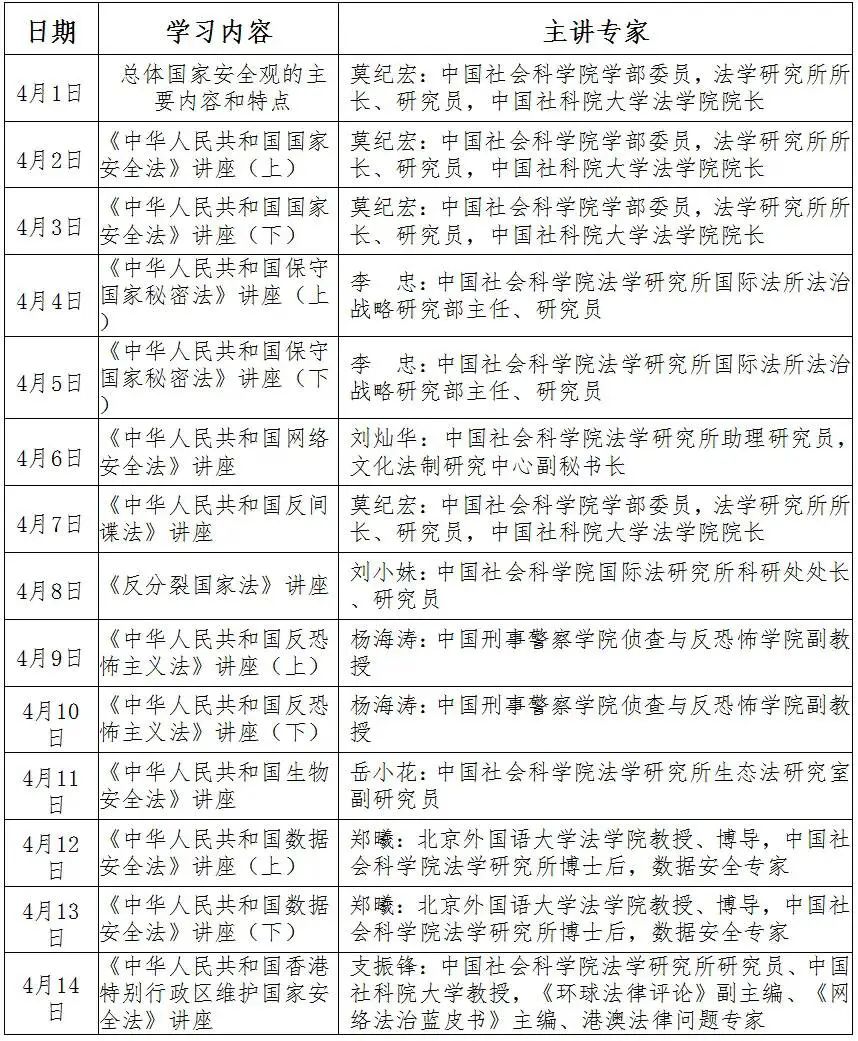 學(xué)習(xí)總體國家安全觀的主要內(nèi)容和特點(diǎn)、國家安全法、國防法、反分裂國家法、反間諜法、保守國家秘密法、反恐怖主義法等。朗讀法律全文。專家講座配備有競答試題。