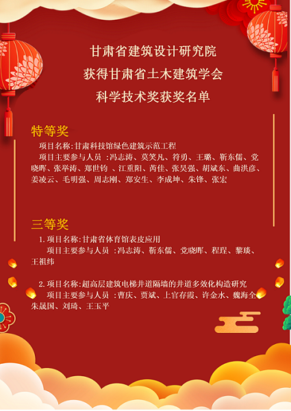 近日,從甘肅省土木建筑學(xué)會傳來好消息,建筑設(shè)計院選送的“甘肅科技館綠色建筑示范工程”“甘肅省體育館表皮應(yīng)用”“超高層建筑電梯井道隔墻的井道多效化構(gòu)造研究”等項目被該學(xué)會分別授予科學(xué)技術(shù)獎特等獎和三等獎。