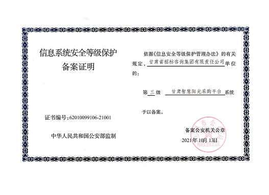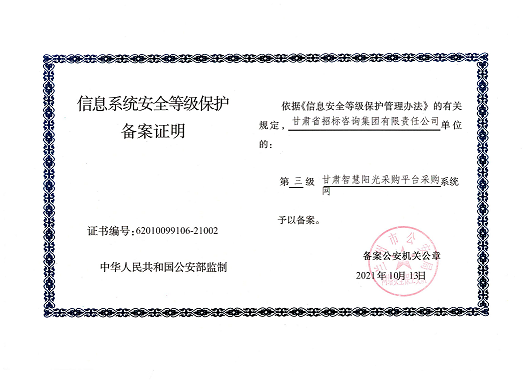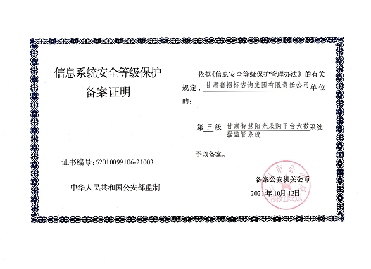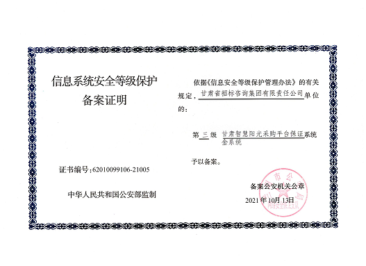近日,由招標(biāo)咨詢集團(tuán)負(fù)責(zé)開(kāi)發(fā)建設(shè)的甘肅智慧陽(yáng)光采購(gòu)平臺(tái)系統(tǒng),以及甘肅智慧陽(yáng)光采購(gòu)平臺(tái)采購(gòu)網(wǎng)系統(tǒng)、大數(shù)據(jù)監(jiān)管系統(tǒng)、招標(biāo)系統(tǒng)、保證金系統(tǒng)、專家管理系統(tǒng)通過(guò)國(guó)家三級(jí)等保認(rèn)證,系統(tǒng)管理安全能力獲得業(yè)界最高標(biāo)準(zhǔn)。