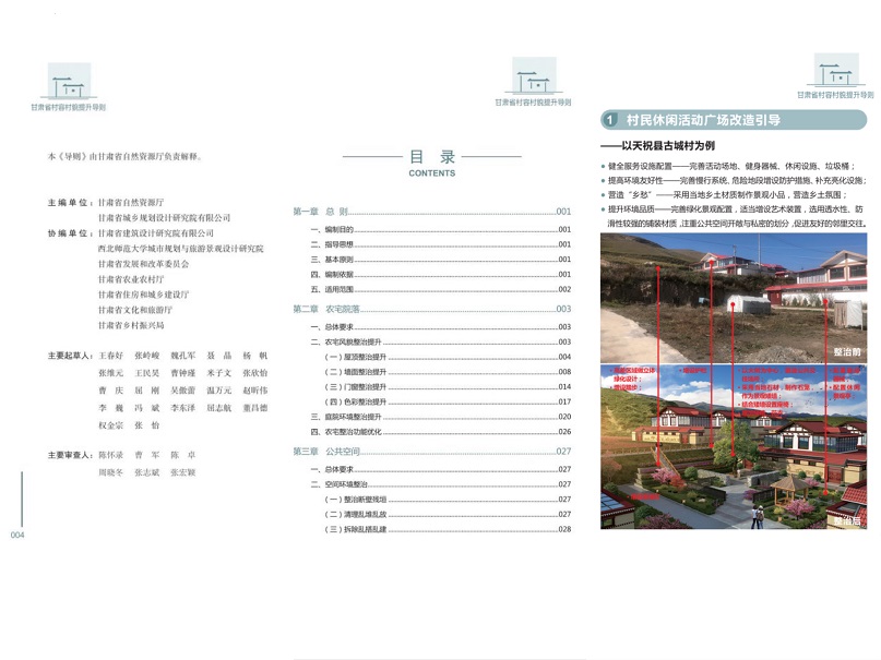 《導(dǎo)則》成果分為提升指引和示例圖集兩部分。提升指引部分以文字形式明確了甘肅省村容村貌整治提升的要求和內(nèi)容,包括總則、農(nóng)宅院落、公共空間、道路街巷、綠化美化、環(huán)境衛(wèi)生、村落保護(hù)、保障機(jī)制和附錄等9個(gè)章節(jié),對(duì)全省5個(gè)國(guó)家級(jí)歷史文化名村和54個(gè)傳統(tǒng)村落實(shí)行特殊保護(hù);示例圖集部分以圖文形式提出了村容村貌提升的多種、可選處理方法和典型案例,主要包括農(nóng)宅院落、公共空間、道路街巷、綠化美化、環(huán)境衛(wèi)生、村落保護(hù)等6部分內(nèi)容。