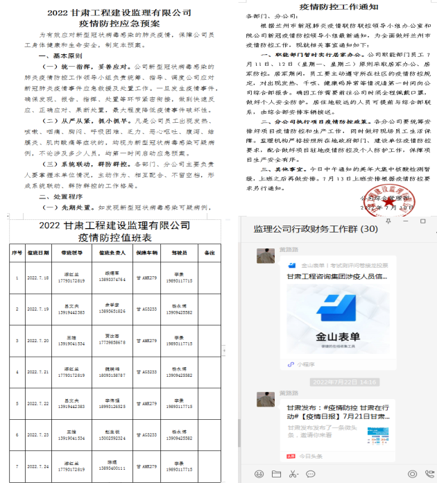 面對(duì)疫情“大考”,甘肅建筑設(shè)計(jì)院以高度的責(zé)任感守護(hù)疫情防控的“省院”防線,在阻擊疫情方面,堅(jiān)持聞令而動(dòng)、令行禁止,做好自身防護(hù)的同時(shí),選派干部響應(yīng)號(hào)召下沉街道,派出志愿者助力轄區(qū)防控,把省市的各項(xiàng)防控舉措落實(shí)落細(xì)落到位;在生產(chǎn)經(jīng)營方面,發(fā)揮科技企業(yè)優(yōu)勢(shì),統(tǒng)籌把握疫情防控與重點(diǎn)工程服務(wù)保障的關(guān)系,做到勘察服務(wù)準(zhǔn)時(shí)高效、外業(yè)作業(yè)安全有序,把損失降到最低。建筑設(shè)計(jì)院各生產(chǎn)單位扭住關(guān)鍵點(diǎn)、打好主動(dòng)戰(zhàn),用一項(xiàng)項(xiàng)“硬核”舉措實(shí)現(xiàn)“自救”解困。瞧!這里就有一份來自建筑設(shè)計(jì)院子公司監(jiān)理公司的“戰(zhàn)報(bào)”。