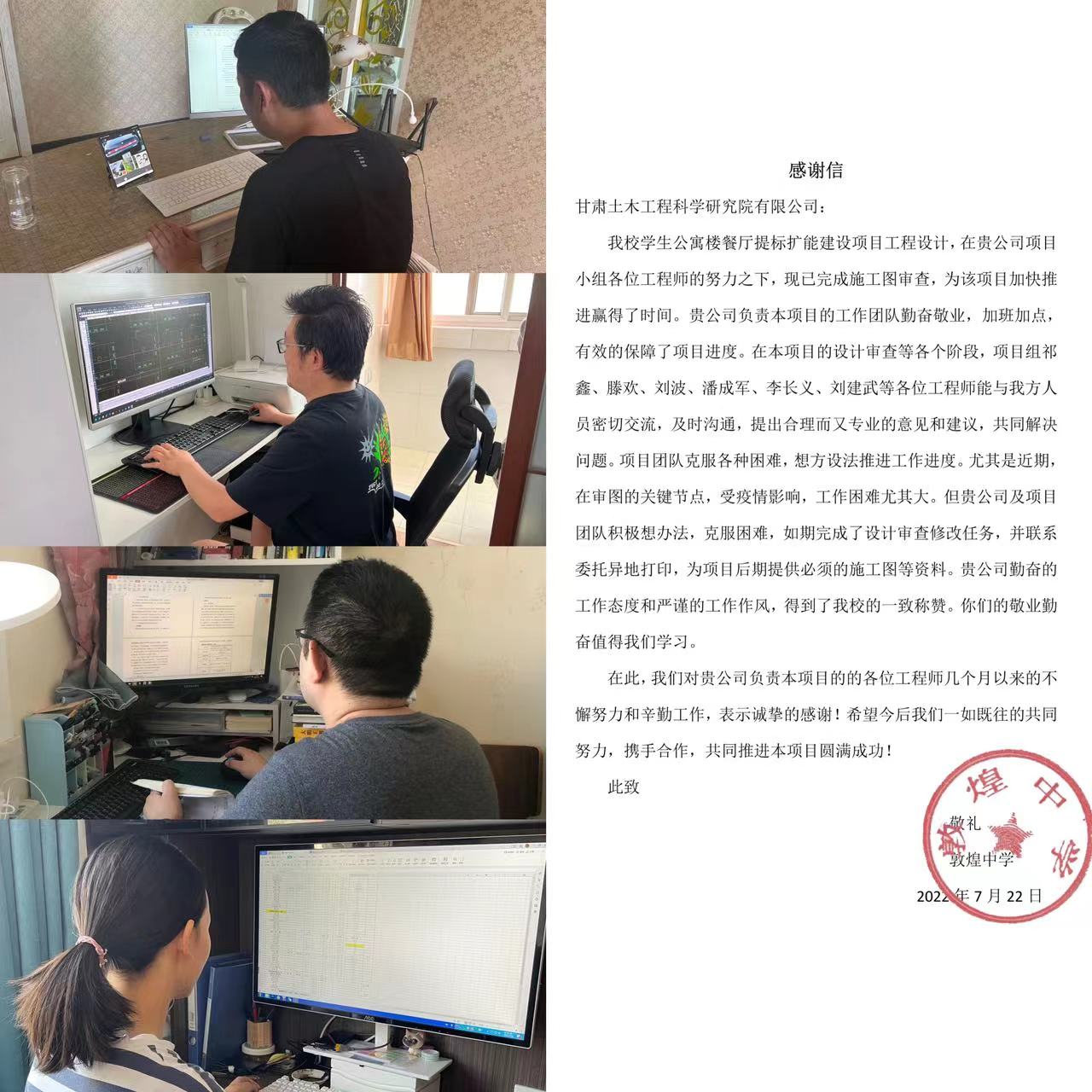 設計一所堅決貫徹土木工程院黨委要求,第一時間部署疫情防控工作。在部門職工居家辦公期間,積極與軟件公司溝通協(xié)調,為所有設計軟件增加了在線使用版,并利用釘釘、微信進行線上溝通,疫情期間完成了2022年華亭市安口鎮(zhèn)老舊小區(qū)住宅樓棚戶區(qū)改造項目施工圖審查、甘肅武威工業(yè)園區(qū)天馬資源開發(fā)有限公司鋼結構標準化廠房建設項目、敦煌中學學生公寓樓餐廳提標擴能建設等項目,得到建設單位的一致好評和致信感謝,極大提升了部門員工技術創(chuàng)新、全方位服務的工作熱情。