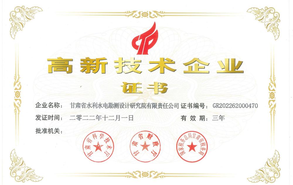 日前,甘肅省水利水電勘測設(shè)計(jì)研究院有限責(zé)任公司獲得甘肅省科技廳、甘肅省財(cái)政廳、國家稅務(wù)總局甘肅省稅務(wù)局聯(lián)合頒發(fā)的“高新技術(shù)企業(yè)證書”(證書編號:GR202262000470),標(biāo)志著水電設(shè)計(jì)院正式邁入國家高新技術(shù)企業(yè)行列,是企業(yè)發(fā)展的又一個(gè)重要里程碑。