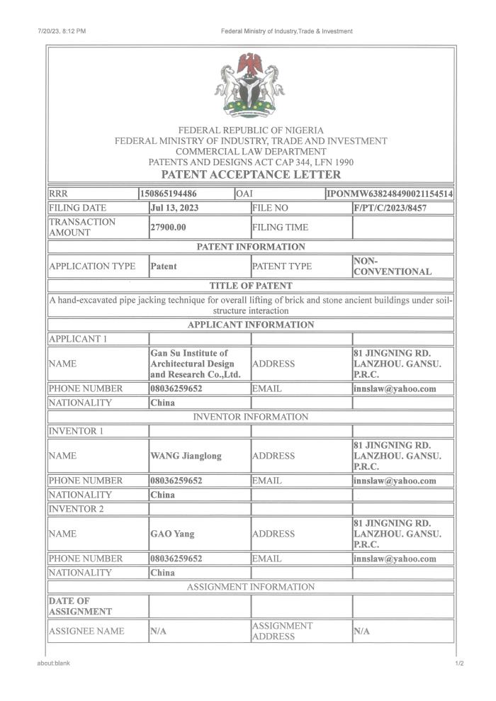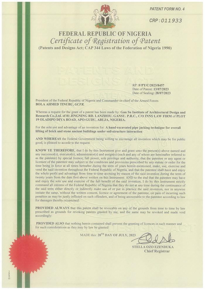 日前,非盟知識(shí)產(chǎn)權(quán)局對(duì)省建筑設(shè)計(jì)院王江龍等申報(bào)的“土-結(jié)構(gòu)相互作用下磚石結(jié)構(gòu)古建筑整體頂升手掘式頂管技術(shù)”(A hand-excavated pipe jacking technique for overall lifting of brick and stone ancient buildings under soil-structure interaction)進(jìn)行授權(quán),為省建筑設(shè)計(jì)院后續(xù)承接援外項(xiàng)目及國外項(xiàng)目給予了堅(jiān)實(shí)的技術(shù)支撐。