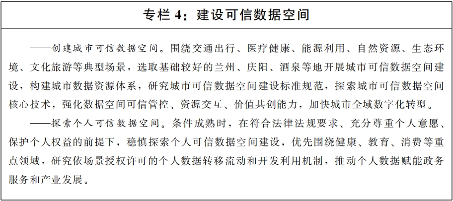 (十一)建設(shè)公共數(shù)據(jù)流通利用基礎(chǔ)設(shè)施。根據(jù)國家政策文件規(guī)定,探索城市、個人等可信數(shù)據(jù)空間建設(shè),鼓勵建設(shè)數(shù)聯(lián)網(wǎng)、數(shù)據(jù)元件等數(shù)據(jù)流通基礎(chǔ)設(shè)施,促進(jìn)數(shù)據(jù)高效便利可信流通。圍繞工業(yè)制造、現(xiàn)代農(nóng)業(yè)、醫(yī)療健康、綠色低碳等重點(diǎn)行業(yè)領(lǐng)域,探索數(shù)據(jù)基礎(chǔ)設(shè)施技術(shù)路線試驗(yàn),為國家數(shù)據(jù)基礎(chǔ)設(shè)施建設(shè)貢獻(xiàn)“甘肅方案”。推動省內(nèi)數(shù)據(jù)基礎(chǔ)設(shè)施規(guī)則、管理、標(biāo)準(zhǔn)相通相容,促進(jìn)跨區(qū)域跨層級設(shè)施互聯(lián)、能力互通,實(shí)現(xiàn)數(shù)據(jù)利用方式向共享匯聚和應(yīng)用服務(wù)能力并重的方向轉(zhuǎn)變。