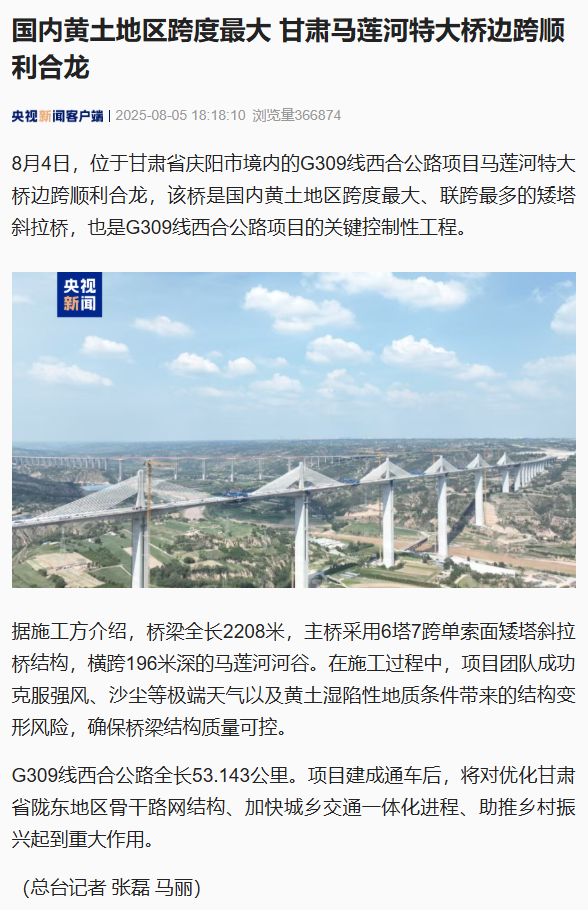 近日,由甘肅工程咨詢集團(tuán)旗下省交通監(jiān)理公司承監(jiān)的G309線西合公路項(xiàng)目建設(shè)取得重大進(jìn)展——馬蓮河特大橋邊跨順利合龍。項(xiàng)目建成后,將進(jìn)一步完善區(qū)域路網(wǎng)結(jié)構(gòu),對促進(jìn)慶陽地區(qū)經(jīng)濟(jì)社會(huì)發(fā)展具有重要意義。