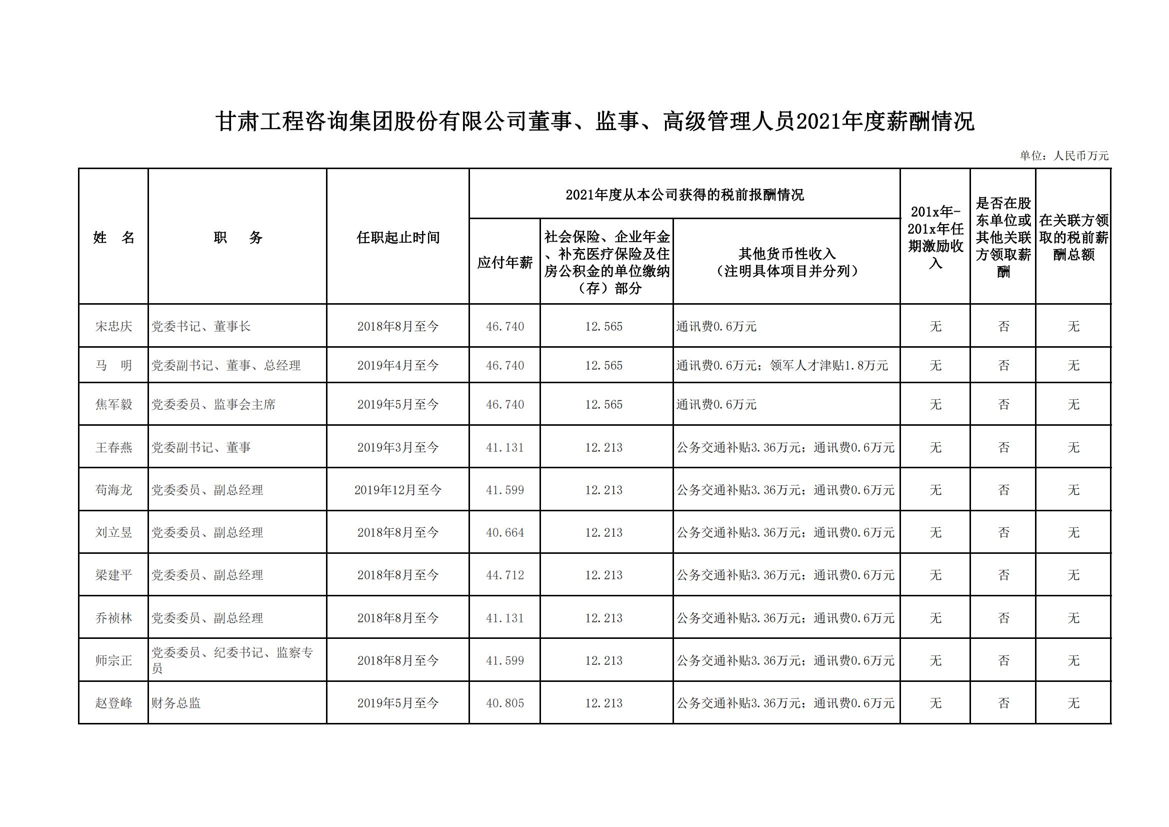 按照《關(guān)于印發(fā)甘肅省省屬國(guó)有企業(yè)負(fù)責(zé)人薪酬管理辦法的通知》(甘人社通〔2021〕310號(hào))相關(guān)要求,現(xiàn)將甘肅工程咨詢集團(tuán)股份有限公司負(fù)責(zé)人2021年度薪酬情況公示如下: