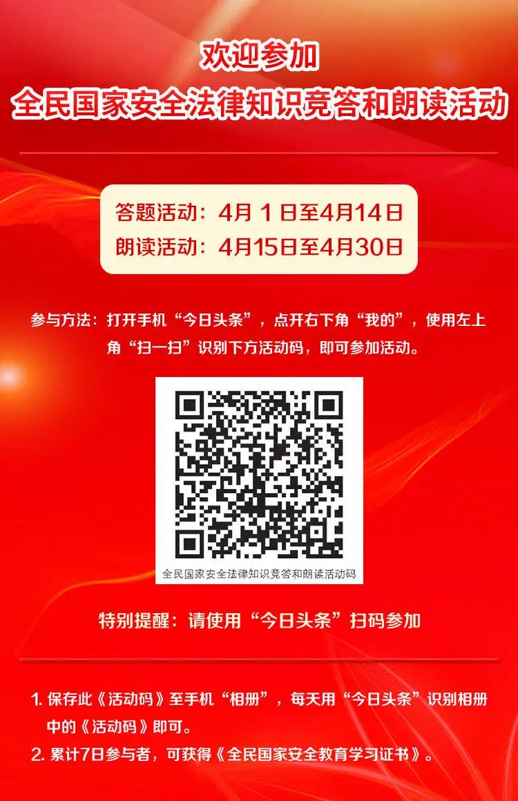 今年是國家安全法頒布施行10周年,4月15日是第十個(gè)全民國家安全教育日。為深入貫徹落實(shí)習(xí)近平總書記關(guān)于全面加強(qiáng)國家安全教育的重要指示批示精神,推進(jìn)國家安全法治宣傳教育走深走實(shí),增強(qiáng)全民國家安全意識和法治意識,倡議大家參加全民國家安全法律知識競答和朗讀活動(dòng)。