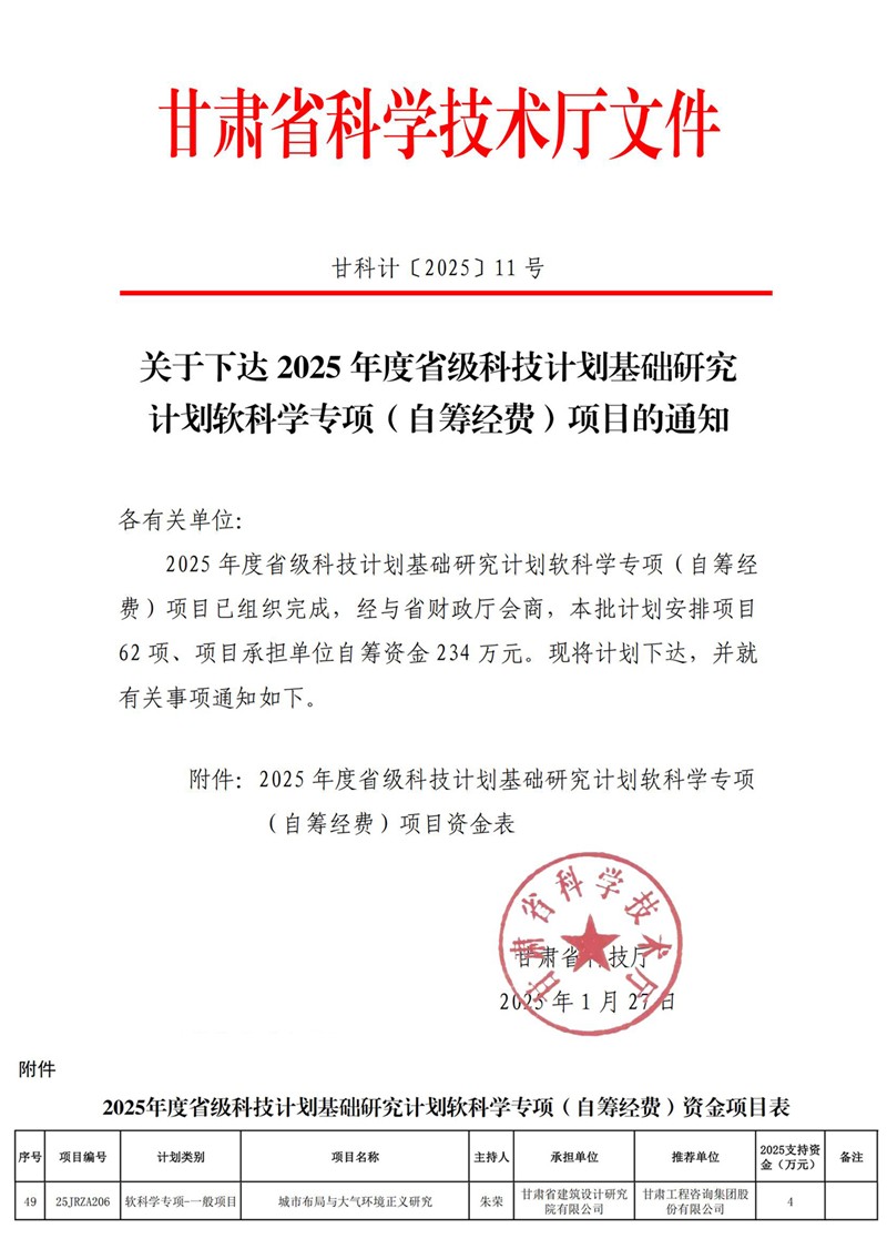 近日,甘肅省科技廳公布了2025年省級科技計劃基礎(chǔ)研究計劃軟科學(xué)專項(自籌經(jīng)費(fèi))項目立項結(jié)果,省建筑設(shè)計院申報的“城市布局與大氣環(huán)境正義研究”項目獲批立項。