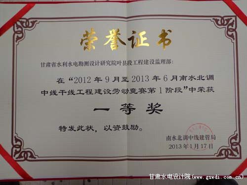 南水北調(diào)中線干線工程建設(shè)勞動競賽一等獎